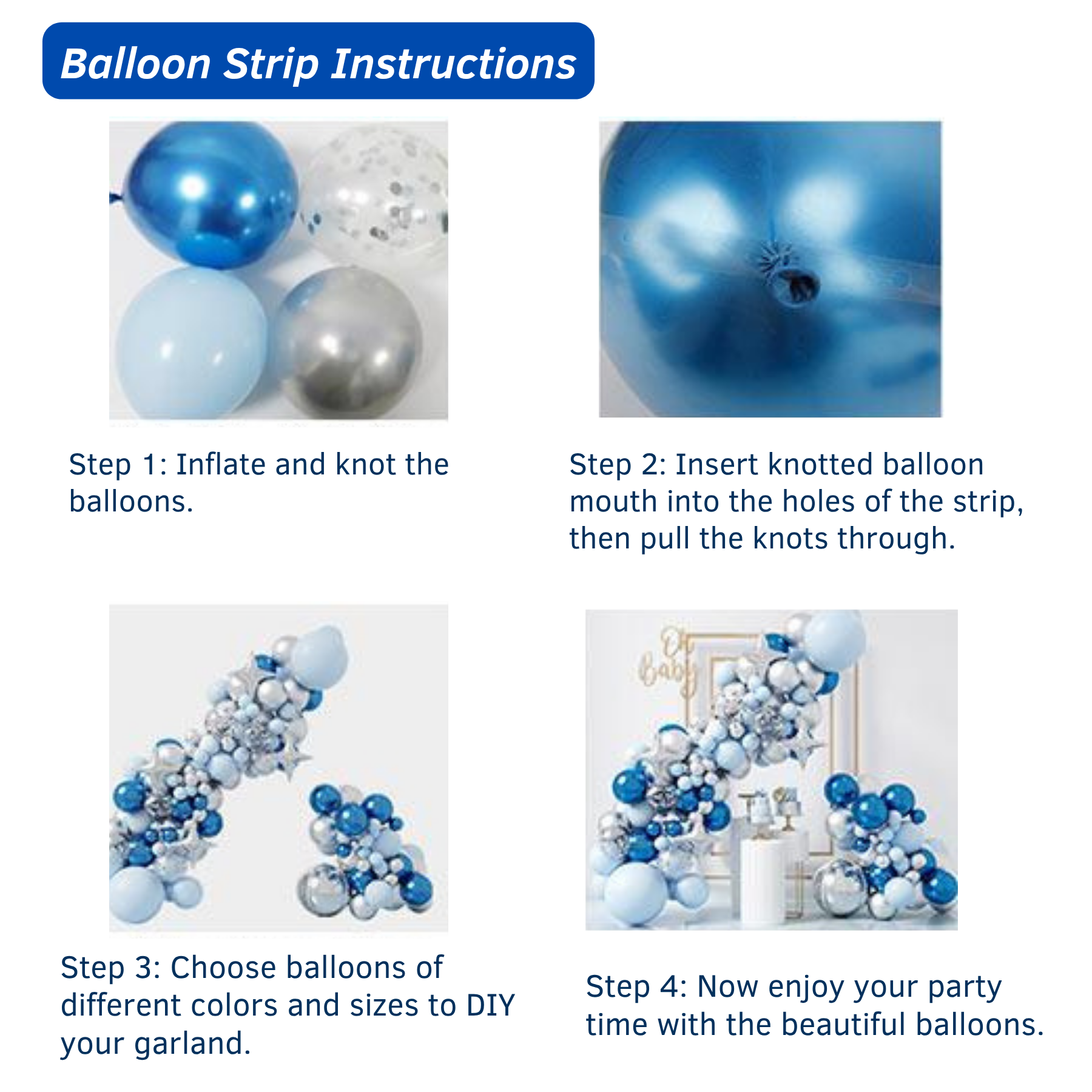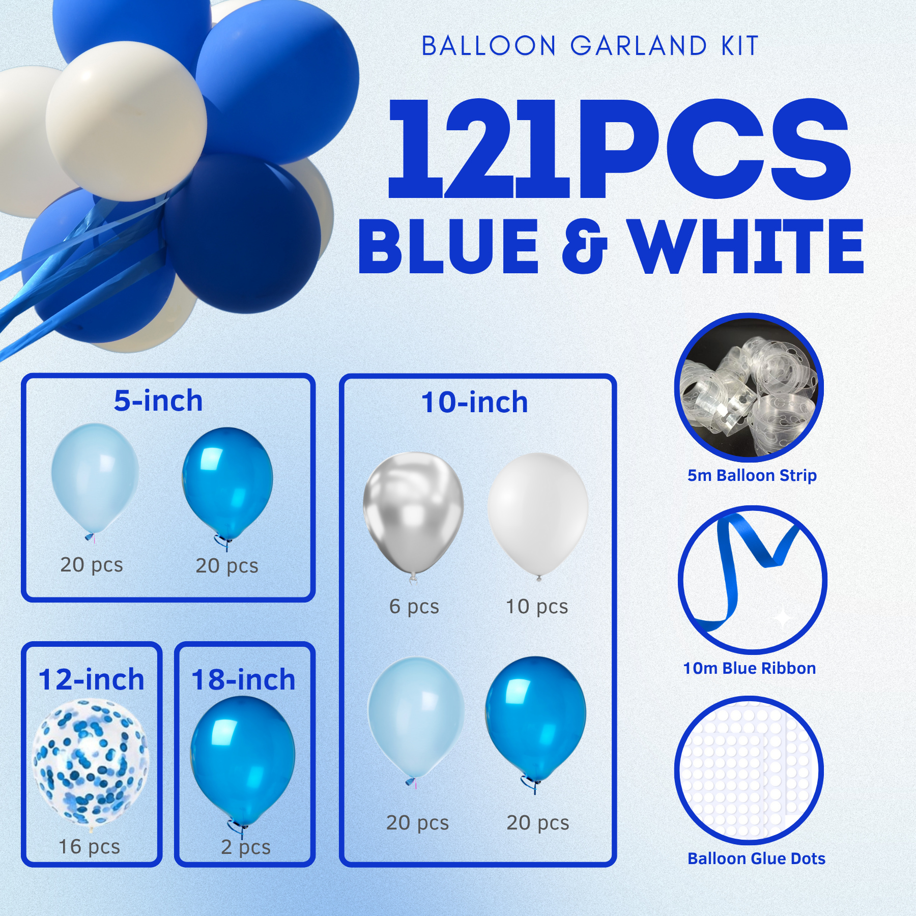 - 【Complete Blue & White Balloon Garland Kit】This kit includes 121 balloons in light blue, metallic blue, white, and silvier (sizes: 18in, 12in, 10in, 5in), along with a 5m garland strip and glue dots. Everything you need to create a stunning balloon arch or garland for your event!